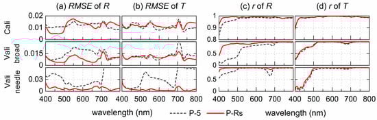 We compared the spectral RMSE and r between the measured spectra and spectra reconstructed by PROSPECT-5 (P-5) and PROSPECT-Rsurf (P-Rs) after model inversion on calibration and validation datasets (Figure 5). RMSE for broadleaf validation leaves obtained with P-5 ranges from 0.01 to 0.03 over 400–800 nm, while for needle leaves RMSE (P-5) is between 0.01 and 0.05 over the VIS and is much higher (>0.06) over the NIR. P-Rs outperforms P-5 over 400-800 nm for both broad and needle samples, with RMSEs decline to lower than 0.015. P-Rs greatly improve R simulation over the VIS for broad leaves. For needle leaves, RMSEs for both R and T decline greatly over 400-800 nm, while the improvement over NIR for needle leaves is predominant with RMSE decreased from over 0.06 to less than 0.01. There are great increases in r for R from 400–700 nm especially over 400–500 nm, whereas the improvements of r for T is minor. The reconstructed R is highly correlated to measurements with r close to 0.9.