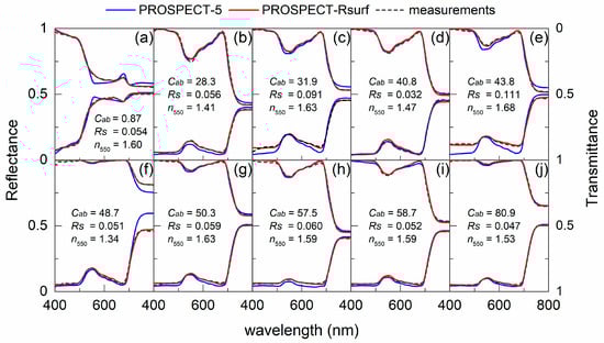 The measured (black dash line) versus simulated (blue line for PROSPECT-5 and red line for PROSPECT-Rsuf) reflectance (lower spectra) and transmittance (upper spectra). These samples include leaves with both low and high N and Cab values. The measured Cab and estimated Rs and nin at 550 nm (n550) values are listed in the plots. The unit of Cab is µg/cm2. Species for the plots are (a) Robinia pseudoacacia ‘Frisia’, (b) Zea mays, (c) Cornus alba ‘Elegantissima’, (d) Triticum aestivum, (e) Eucalyptus gunnii, (f) Picea mariana (Mill.), (g) Salix atrocinerea, (h) Populus nigra, (i) Alnus glutinosa, and (j) Ligustrum lucidum, respectively.