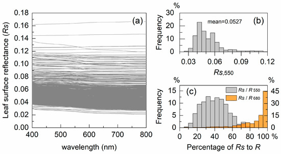 (a) Estimated leaf surface layer reflectance (Rs) for all leaf samples. (b) Distribution of Rs at 550 nm for all the samples. (c) Distribution of the proportion of Rs to leaf total reflectance at 550 nm (grey bars) and 680 nm (orange bars), respectively.