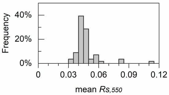 Histogram of mean 550 nm leaf surface layer reflectance (Rs) values of the 56 plant species.