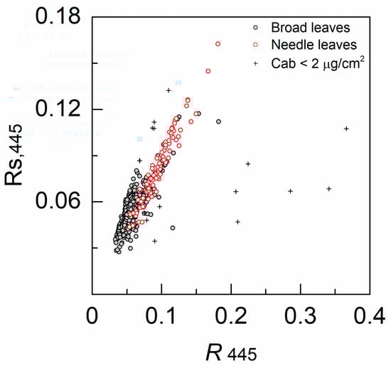 The estimated Rs is found to be strongly correlated to leaf reflectance around 445 nm (R445), except for broad leaves with extremely low Cab (<2 µg/cm2, black cross in Figure 9). There is a slight difference in the R445 and Rs relationship between broad and needle leaves.