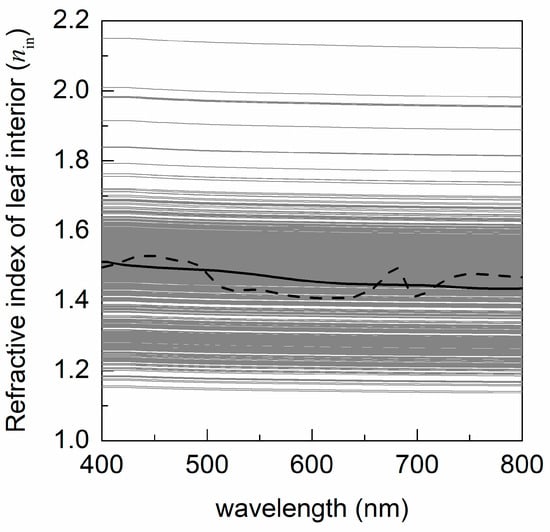 The estimated leaf interior refractive index (nin) is demonstrated in Figure 10. For most of the samples, nin values are in the range from 1.2 to 2.0. The refractive index used in PROSPECT-3 and PROSPECT-5 are in the range of the estimated leaf interior refractive indices. Similar to the refractive index used in PROSPECT-3 and PROSPECT-D, spectral variation of the estimated leaf interior refractive index is minor. The estimated spectra of nin conform with the leaf refractive indices derived from K–K relations [39].