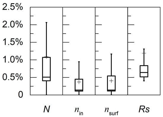 The surface layer reflectance (Rs) is characterized by the refractive indices of the additional surface layer (nsurf) and the interior layers (nin) in PROSPECT-Rsurf. The leaf surface layer and interior refractive indices derived from model inversion are comparable to the leaf refractive index obtained by Kramers–Kronig (K–K) transformations [39]. The derived leaf surface and interior layer refractive indices should not be considered as true representations of leaf surface and interior refractive indices but as equivalent parameters compensating for leaf surface reflectance and internal multiple scattering, respectively. The spectral variations of nsurf and nin are minor, resulting in relatively flat leaf surface layer reflectance spectra in 400–800 nm, which are consistent with the findings that leaf specular reflectance from a surface is usually considered as wavelength-independent [13], as the cuticle and cell walls of leaf epidermis usually contain no pigments [7].