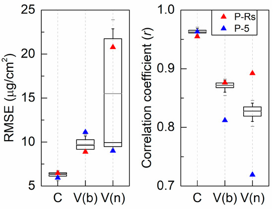 Figure 3 compares the performances of chlorophyll content estimation for PROSPECT-Rsurf (P-Rs) to PROSPECT-5 (P-5). The color of the points in Figure 3 corresponds to the surface layer reflectance (Rs). The results are demonstrated in three groups: the calibration, broadleaf samples in validation, and needle leaves in validation datasets. Estimation of Cab using P-Rs is improved for the broad leaves in validation datasets (Figure 3b), with RMSE decreasing from 11.12 to 8.87 µg/cm2, r increasing from 0.81 to 0.88, and BIAS adjusted from −3.31 to 0.65. For some of the broadleaf validation samples with high Rs, the underestimation of Cab using P-5 due to the underestimation of Rs is alleviated in P-Rs with BIAS close to 0 (0.65). Furthermore, the overestimation of extremely low Cab samples is corrected.