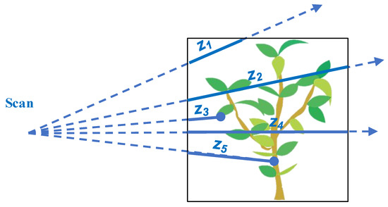 This amount was calculated by multiplying the reference attenuation coefficient of this voxel (computed from Equation C3) by the length of the segment corresponding to the intersection of the beam and the voxel. When the residual optical path of the beam was shorter than this amount, a hit occurred within this voxel at a location corresponding to this residual optical path. On the contrary, when the remaining optical path was greater than this amount, it meant that the beam travelled farther than the voxel. The process was recursively applied to the next voxel—the “new” residual optical path corresponding to the remaining of the previous one. The process ended in the case of a hit, or when a beam reached the bounding box of the computational grid. In this later case, the beam was never intercepted in the computational grid, thus corresponding to a beam with no hit. This process was similar to the one used in a previous study [20] to simulate photon trajectories to compute the radiative transfer from a flame through a voxelized heterogeneous vegetation scene with a Monte Carlo approach. Hence, five virtual point clouds were simulated in accordance with , which accounted for both vegetation and instrument properties.