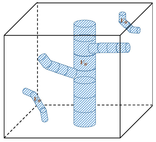 Scheme of the representation of wood volumes (in dashed blue) in the voxel of volume . We assume that leaf elements are randomly distributed in volume , which exhibits a very complex and unknown topology.