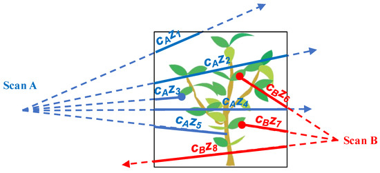 Scheme of the information provided by the traversal algorithm, which is used to compute the Maximum Likelihood Estimator (MLE) of the Leaf Area Density (LAD) from multiview data from Scan A (in red) and Scan B (in blue): leaf hits (blue and red dots) and free paths (distances z travelled by the beams; blue and red lines) in the voxel. The dotted lines represent pulse trajectories; and represent the correcting factors for viewpoints A and B, respectively, which differs with distance to scanner and view angle. For simplicity, correction for effective free path (; Equation (3)) is ignored. Note that in this framework, no leaf can be distributed within the volume occupied by wood elements (in brown). Also, and contrary to Figure 1, the hits corresponding to woody elements (e.g., 5th beam of scan 1) are ignored in the hit sum, but the corresponding free paths are accounted for in the free-path sum, in which cA and cB are used as multiplicative factors.