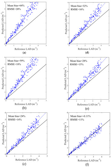 Comparison between predicted and reference LAD for a variety of formulations to account for wood in estimators (see Table 1 for details): (a) Equation (7); (b) Equation (8); (c) Equation (15), (with , >>1, and ); (d) Equation (7), with multiplicative factor; (e) Equation (8), with multiplicative factor; (f) Equation (15) (>>1 and ). Formulations presented in subplots (a–c) ignored wood volumes, contrary to subplots (d–f).