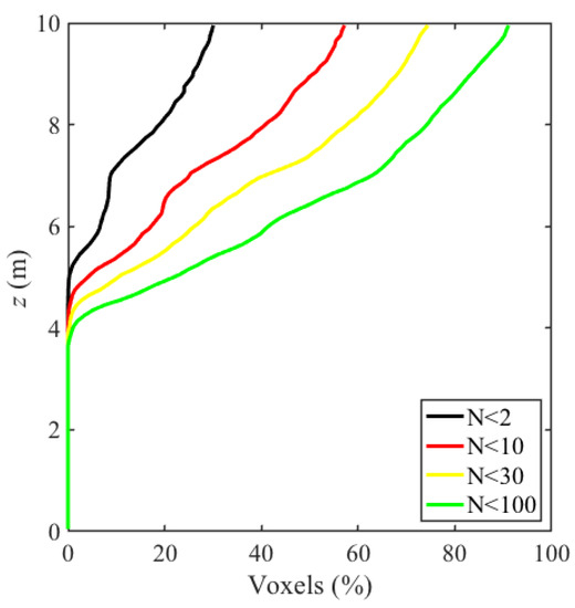 Vertical profiles of percentages of voxels with number of beams smaller than 2, 10, 30, and 100, in the numerical experiment described in Appendix C (five different viewpoints located at 1 m above the ground).