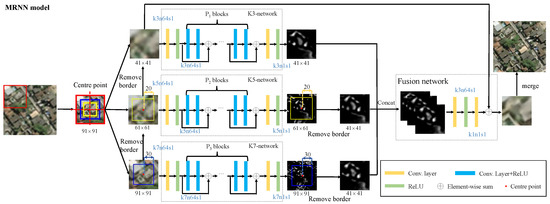Inspired by the observation of “look closer to see better” [32], we propose a flexible and versatile multi-scale residual deep neural network for satellite image SR, named MRNN, for the hierarchical reconstruction of satellite imagery with HR detail information. In this network, multi-scale receptive fields are similar to the observation from different distances by human eyes. We extract three scales of the image at large- (large-kernel-size network, for global information), middle- (middle-kernel-size network, for contextual information) and small-scale (small-kernel-size network, for fine local information) features to represent the multi-scale information of images. In comparison with traditional neural networks, MRNN fuses the residual information rather than intermediate features. Thus, the fusion network fuses all scales of residual information to improve the high-frequency details.
