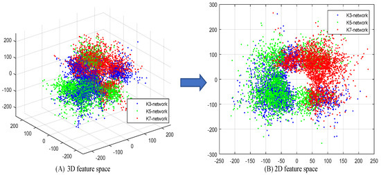 (A,B) are the visualizations of the estimation residual error map distributions in 3D and 2D feature spaces, respectively. Blue points represent the residual coming from the K3-network, while green and red points represent the K5- and K7- networks, respectively.