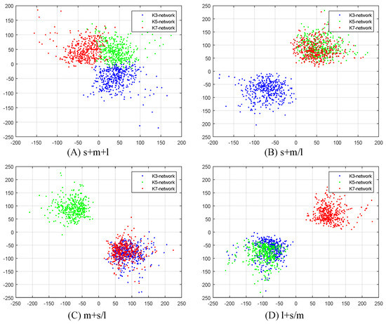 The distribution maps in Figure 3 cannot clearly describe the complementary patterns of multi-scale residual. Therefore, we implemented the clustering of data by k-means and obtained their distribution of 2D feature space, as shown in Figure 4. We name the four patterns as “”, “”, “”, and “”. Pattern “” represents the best case, that is, the high-frequency information of three scales is complementary between any two. The latter three patterns can be classified as: the information of two scales is considerably common, but a complementary relationship also exists, whereas the other scale complements them. This behavior effectively demonstrates the complementarity between multi-scale residuals.