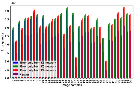 where represents the absolute value of the matrix in an element-wise manner. The function can count the number of nonzero elements in a matrix. represents the number of elements whose values are greater than threshold t. denotes the number of above elements at the same locations in three error residual maps. We refer to Wang et al. [52] and set to represent high-value components (high-frequency information signals). Figure 5 plots the bar. The blue bar represents the error only from the K3-network, and the green and red bars indicate the errors only from the K5- and K7-networks, respectively. is the purple bar. , and networks of different scales play different roles in the proposed method.