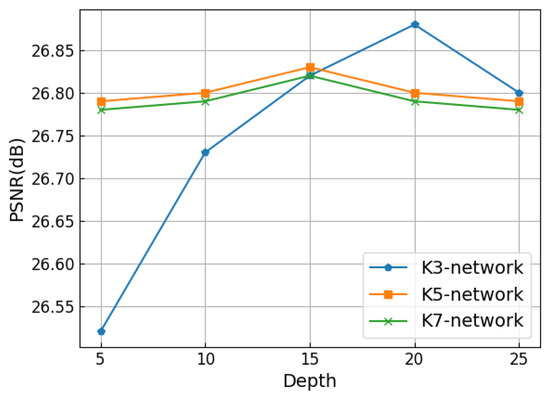 We configured the multi-scale residual network to different depths and compared their performance. We set D at 5, 10, 15, 20, and 25 to test the network performance. The input image patch size changed when the network depth changed. We used PSNR to measure the network performance, as shown in Figure 6. For the K3-network, the performance was optimal when D was 20. For K5- and K7- networks, the performance of networks was optimal when D was 15. The receptive field of the D-layer network is defined as , and k is the kernel size.
