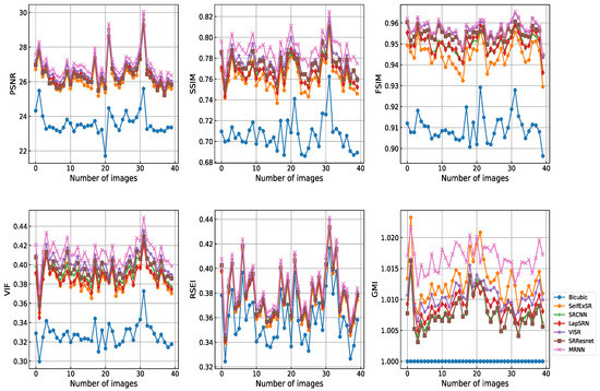 Objective results of SR algorithms over SpaceNet satellite images. X-axes represent the index of testing samples. Y-axes indicate evaluation index: PSNR, SSIM, FSIM, VIF, RSEI, and GMI.