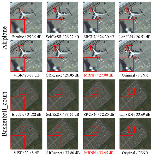 The images from NWPU-RESISC45 with scale factor 4×. Only MRNN successfully recovered the edge of the airplane’s head. The contour in the image is sharp in the result of MRNN.
