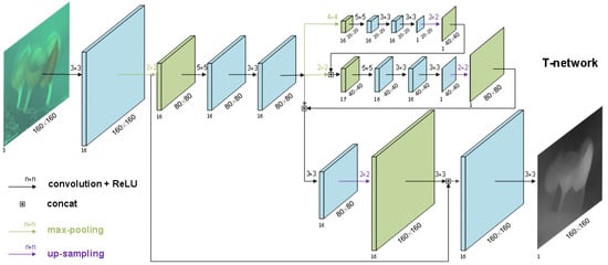 We choose Middlebury Stereo dataset [36,37] as the indoor depth dataset. In addition, we use clear outdoor images from the Internet and Liu et al. [38]’s depth map estimation model to generate the outdoor depth dataset. We crop images into smaller ones with size of pixels. Following the steps in Section 3.5, we use 477 clean images and corresponding depth maps to generate 13,780 underwater images and their corresponding transmission maps to train the T-network, and 20,670 underwater images and their corresponding ambient light to train the A-network. Note that the training images for the A-network are resized to pixels by nearest interpolation.
