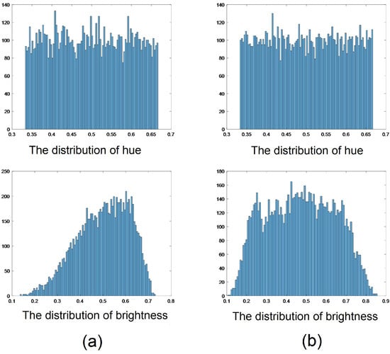 Hue and brightness distribution of global ambient light. (a) the ambient light generated using a uniform distribution; (b) the ambient light generated using the modified distribution (note that the value of green-blue hue is 0.33–0.66).
