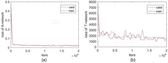 The training and validation loss of A-network and T-network over the training process are shown in Figure 8a,b, respectively. Note that training T-network requires more memory than A-network because the input/output size of T-network is much larger than that of A-network. Due to the memory limits of the device, a much smaller batch size is set in T-network training, which lead to a continuous fluctuation in the training loss curve of T-network, as depicted in Figure 8b. By considering that the validation loss curve of T-network converges after 15 k iterations, we stop the training process at 20 k iterations.