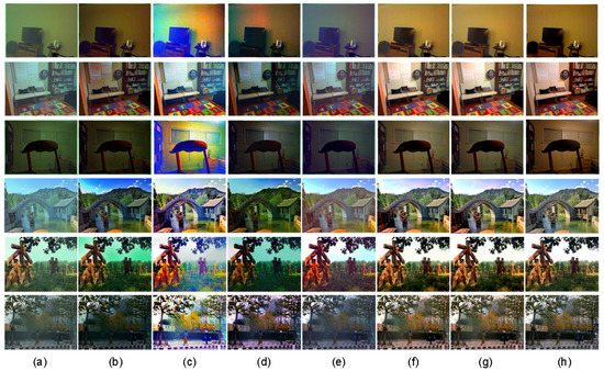 As shown in Figure 11b,c,e, the authors in [12,13,24] succeed in enhancing contrast of the recovered images and enriching the details, but they tend to over-enhance and produce reddish results. The authors in [20] can only increase the contrast of images, but fail to correct color deviation, as depicted in Figure 11d because it assumes that the attenuations of three color channels are the same, which is actually invalid in underwater environments. According to Figure 11f, the authors in [25] perform well on contrast enhancement and color correction, but it generates over-enhanced and over-saturated results when the ambient light is significantly brighter than the scene. It can be seen from Figure 11g that the results of [29] tend to have poor visibility with low contrast and hue distortion due to the inaccurately estimated transmission and ambient light. In contrast, our method produces images with natural color, enhanced contrast, and visually pleasing visibility, as illustrated in Figure 11h. Therefore, although the proposed network is trained using synthetic underwater images, it is capable of delivering more satisfactory restoration results on real-world degraded underwater images as compared to the state-of-the-art methods.