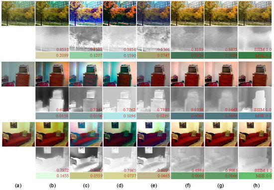 In the work by Shin et al. [29], a large number of small local patches (with the constant transmission map) are used to train the network for transmission map estimation. Because only local information is considered, the estimation results tend to be influenced by color information. In contrast, our network is trained using full-size images, thus acquires the ability to preserve global spatial structures. Moreover, the restoration result will likely suffer from halo artifacts when the depth boundary is not accurately captured in the transmission map. As Ref. [29] is patch-based, the estimated transmission map needs to be refined by guided filtering to prevent serious halo artifacts. However, this is not needed for our method due to the use of cross-layer connection and multi-scale estimation in the proposed T-network. To demonstrate that cross-layer connection and multi-scale estimation are essential for the edge-preserving ability of our T-network, we train three different networks using the same dataset generated by our synthesizing method and compare their respective transmission estimation results in Figure 14. As shown in Figure 14c, the U-shaped structure alone (DFCRN [28]) cannot preserve edge features well. With multi-scale estimation incorporated into the U-shaped structure, the resulting estimation shows more details (Figure 14d). The result further improves when both multi-scale estimation and cross-layer connection are added to the U-shaped (which becomes our T-network)—see Figure 14e. This ablation study clearly shows importance of cross-layer connection and multi-scale estimation.