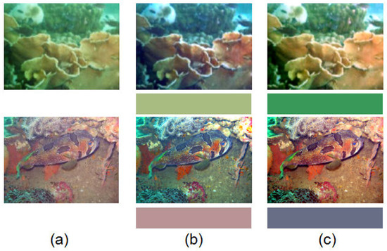 Comparisons on the estimated ambient light and restoration results. Each ambient light is visualized as a colored bar for the convenience of comparison. (a) underwater images; (b) the results of Shin et al. [29]; (c) the results of the proposed method.