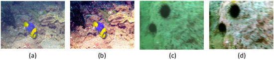Underwater imaging has found important applications in diverse research areas such as marine biology and archaeology [1,2], underwater surveying and mapping [3], and underwater target detection [4,5]. However, captured underwater images are generally degraded by scattering and absorption. Scattering means a change of direction of light after collision with suspended particles in water, which causes the blurring and low contrast of images. Absorption means light absorbed by suspended particles which depends on the wavelength of each light beam [6]. Because the light with shorter wavelength (i.e., green and blue light) travels longer in water, the underwater images generally have predominantly green-blue hue. Contrast loss and color deviation are the main consequences of underwater degradation processes(e.g., Figure 1), which may cause difficulties for further processing, and it is of considerable interest to remove such distortions.