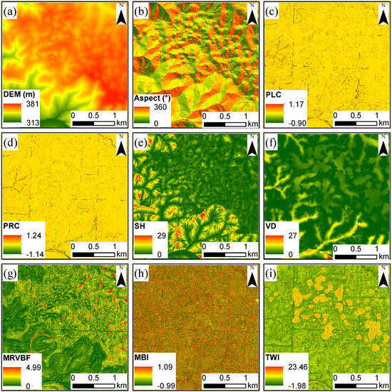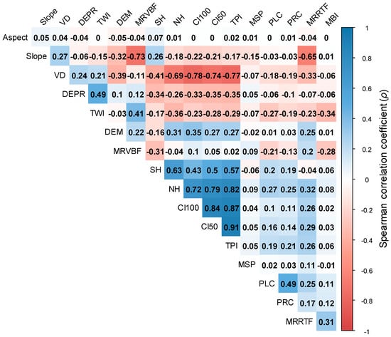 - Sixteen geomorphometric parameters were derived from DEM data, and a test for multicollinearity was conducted using both the Spearman correlation coefficient and VIF criteria. As a result, seven out of sixteen parameters were found to be highly correlated and were excluded in the further analyses. The selected nine parameters were DEM, aspect, plan curvature, profile curvature, slope height, valley depth, MRVBF, MBI, and TWI.