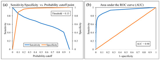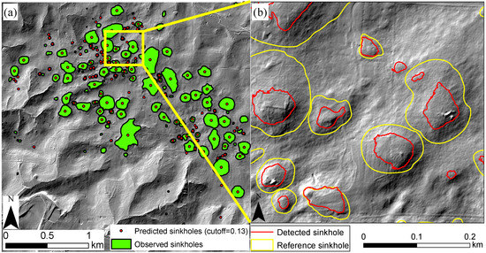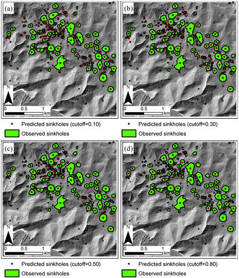 - Logistic regression was used to construct the probabilistic sinkhole susceptibility map using the reported sinkhole inventory. In order to define the appropriate sinkhole boundaries from the probabilistic sinkhole susceptibility map, it is important to determine the optimal cutoff value. In this study, the recommended cutoff value was calculated to be 0.13, which has maximum sensitivity and specificity values at the same time.