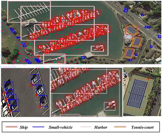 With the rapid development and progress of remote sensing technology, object detection in remote sensing images has attracted more and more attention from researchers owing to its wide application in many areas, such as urban planning [1], resource and environment survey [2], and traffic control [3]. Nevertheless, it is still a challenging task to achieve accurate object detection because the targets usually appear with diverse sizes and aspect ratios in remote sensing images. For example, as shown in Figure 1, the vehicle objects are small while the harbor objects are large and their aspect ratios differ significantly.