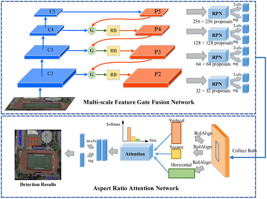 The overall framework of our Adaptively Aspect Ratio Multi-Scale Network (ARMNet) for object detection is illustrated in Figure 3, which is based on Faster R-CNN [21] and FPN [33]. It consists of two components: Multi-scale Feature Gate Fusion Network and Aspect Ratio Attention Network. Given a remote sensing image, a multi-scale feature gate fusion network adaptively aggregates semantic features of different scale using gate fusion modules and refine blocks. A great deal of region proposals at various scales are generated on the fused multi-scale feature maps using RPN, respectively. Furthermore, in order to preserve the aspect ratios of objects, an aspect ratio attention network utilizes the relevance scores to select the RoI features that match the shapes of objects. This network guarantees more accurate classification and localization for objects of various aspect ratios.