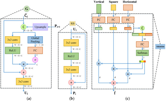 (a) The network structure diagram of the gate fusion module. The feature maps generated by the feature maps from the backbone network and the last fused feature maps are fed into the gate fusion module for getting the fused feature maps . (b) The network structure diagram of the refine block. It is used to refine the expressive powers of the feature maps . (c) The network structure diagram of the aspect ratio attention network. It adaptively selects the features with suitable aspect ratios or shapes for more accurate classification and localization. and C denote sigmoid function and concatenate operator. ⊗ is channel-wise product operator and ⊕ is element-wise sum operator.