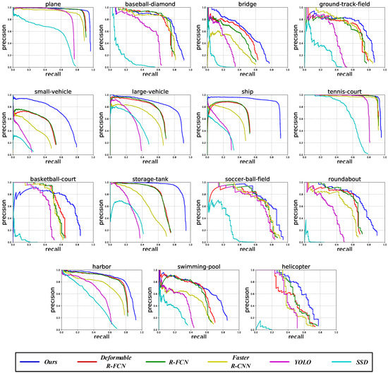 For ease of understanding, Figure 5 shows the P-R curves of our ARMNet method and the other state-of-the-art methods. We can see that the area under the blue line (ours) is larger than that under the other lines for the 15 categories of DOTA dataset [4]. When the recall is determined, the precision of ARMNet is higher than other methods. When the precision value is given, our recall is also higher than other methods. In short, the proposed ARMNet method has better performance than the other methods.