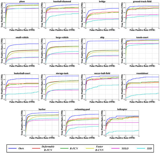 where TPR is equivalent to recall. Figure 6 shows the ROC curves of different methods for each category on the DOTA dataset. The closer the ROC curve is to the upper left corner (0,1), the better the detection performance of the network. It can be observed that our method achieves better performance than other existing methods.