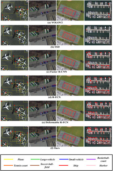 In Table 5, the performance of some current state-of-the-art detection networks on DOTA dataset [4] is evaluated, such as YOLOv2 (https://pjreddie.com/darknet/yolo/) [43] based on Darknet19, Inceptionv2 [45] for SSD (https://github.com/tensorflow/models/tree/master/research/object_detection) [44], and ResNet-101 [24] for R-FCN (https://github.com/msracver/Deformable-ConvNets) [41], Deformable R-FCN (https://github.com/msracver/Deformable-ConvNets) [42] and Faster R-CNN (https://github.com/msracver/Deformable-ConvNets) [21]. Note that the performance of existing methods in Table 5 is taken from [4,46]. In order to evaluate the performance of our method on the test set of DOTA dataset [4], we adopt multi-scale training and testing strategies due to the large-scale of DOTA dataset [4]. In Table 5, it is remarkably shown that our approach has better performance, which greatly exceeds the Faster R-CNN [21] by 18% at mAP. The detection performance of SSD [44] is the lowest among these approaches mentioned in Table 5, although it uses multi-scale feature maps. The main reason may be that it only uses the low-level feature maps for small objects, resulting in inadequate feature extraction, high-level feature maps for large targets, resulting in the loss of detail information. Moreover, the performance of our method also exceeds Deformable R-FCN [42], which adjusts the size and shape of receptive field to detect objects of various sizes and aspect ratios. In addition, our method outperforms the recent two methods by Azimi et al. [47] and Yan et al. [46] by 6% and 5.73%, respectively.