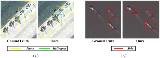 Figure 9 shows two main types of mistakes. The first type of mistake occurs when objects have similar appearance features. For example, in Figure 9a, our method incorrectly classifies the plane object as helicopter. Another case is that our method sometimes generates some noisy bounding boxes that do not tightly surround the objects. For instance, in Figure 9b, some bounding boxes inaccurately located the ship objects, although they are correctly classified. One possible reason for this case is that we divide positive and negative samples using a lower IoU threshold of 0.5 during training, which makes it difficult to train detectors that can effectively reject close false positive samples.