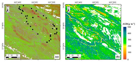 Study area. (a) MCD43A4 image from August 13, 2017 (the R, G, and B color space correspond to bands 6, 2, and 1, respectively). Sampling plots for the field aboveground biomass measurements are displayed as black dots. (b) is the reference aboveground biomass (AGB) map used to validate the proposed method. The white pixels in (a,b) are bad-quality and non-grassland pixels, respectively. For details regarding the generation of (b), please see [6].