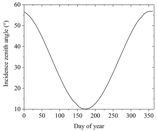The incidence angle of the MCD43A4 product has been normalized to local solar noon of the day, which will change across the study year (2017). Yet, the local solar noon zenith angle within the study area would not cover too wide range, considering the limited space of our study area (Figure 1). Therefore, the incidence angle of the central pixel can be safely use to represent the entire study area. Figure 2 illustrates the temporal variation of the incidence zenith angle for the central pixel computed using an astronomical model [32]. The incidence angle is very oblique during winter: the incidence zenith angle is more than 50° at the beginning and ending of the study year. Whilst the minimum incidence zenith angle (~10°) appeared in the summer solstice day (DOY 172).
