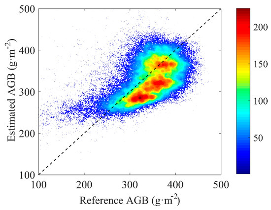 Density scatterplots between the estimated and reference aboveground biomass (AGB) in DOY 225, 2017.