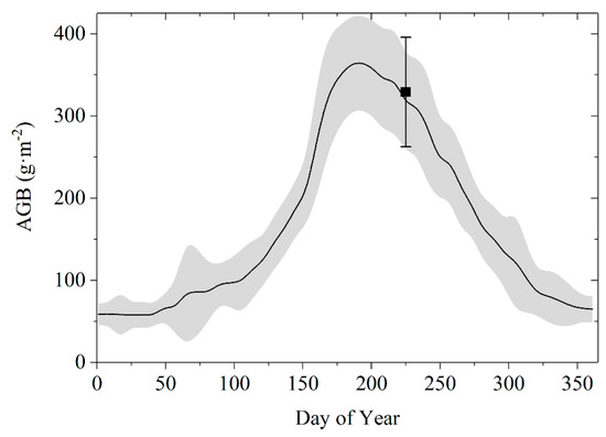 The temporal evolution of estimated AGB for our study area is shown in Figure 5. From a first analysis, the estimated AGB satisfactorily reproduces the seasonal variation and fits the mean value of the reference map very well. The growing season of the grassland spanned from ~ DOY 81 to 313. The growing peak appeared on ~ DOY 193, with value of 365.3 g·m−2. Note that the AGB in dormancy was not zero. This is because the grassland in our study area is divided into summer pastures and winter pastures by local people [30], and the winter pastures are adhered to much withered grass to feed the livestock during winter.