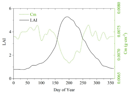 It is worth noting that the estimated temporal evolution of Cm is shaky, especially in the dormancy and senescence periods (Figure 6). However, the realistic variation of Cm would not be so shaky. In fact, this fake variation is caused by the lack of information content of MODIS bands to estimate Cm. For example, Wang et al. [24] found that a narrow-band, normalized index combining two distinct wavebands centered at 1649 nm and 1722 nm was needed to estimate Cm, and Féret et al. found that reflectance at 1500 nm is also critical for estimating Cm [25]. Yet MODIS sensor cannot collect reflectance at the above three key bands (see Table 1). More advanced sensors with dedicated band configuration are needed to further improve Cm retrieval accuracy in future.
