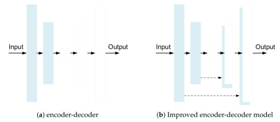 To recover detailed information which losts in the down-sampling process, skip connections are added to the encoder-decoder network [15,16,24,37,38,39]. U-net [16] is a symmetrical U-shaped network, which uses skip connection to combine the feature map of the up-sampling layer from the right expansive path with the feature map of the pooling layer from the left contracting path. Residual encoder-decoder network (RedNet) [39] uses skip connection to bypass the spatial information and proposes fusion structure to introduce depth information into the network. Refs. [24,37] use fully convolutional encoder-decoder structure, and the feature maps of convolution layer are skip-connected to the corresponding deconvolution layer. Learning from [24,37], to connect the encoding part directly to the corresponding decoding part, a skip connection is added between i-th layer and -th layer, as shown in Figure 3. This kind of connection can avoid the bottleneck and directly transmit the shallow layer information to the deep layer, so as to restore the details better. In addition, more detailed information can be obtained by fusing the feature maps of some layers in the network.