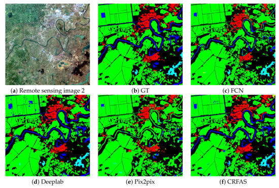 After observing the above four confusion matrixes, it can be seen that CRFAS has the highest overall accuracy and good robustness. For data set 1, compared with Deeplab, CRFAS has higher accuracy in road and farmland categories. The confusion matrix of the complete data set 2 is shown in Table 5. From Table 5, it can be seen that CRFAS has the highest overall accuracy and good performance in farmland, water, and building categories. For forest category, the accuracy of CRFAS is not as good as Deeplab’s. These four methods did not perform well in grassland category.