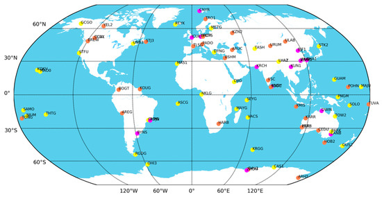 Distributions of precise orbit determination (POD). Magenta points are international GNSS Monitoring and Assessment System (iGMAS) stations, which can track all BeiDou-2/3 satellites. The others are Multi-GNSS Experiment (MGEX) stations, and the orange point can track BeiDou-3 satellites.