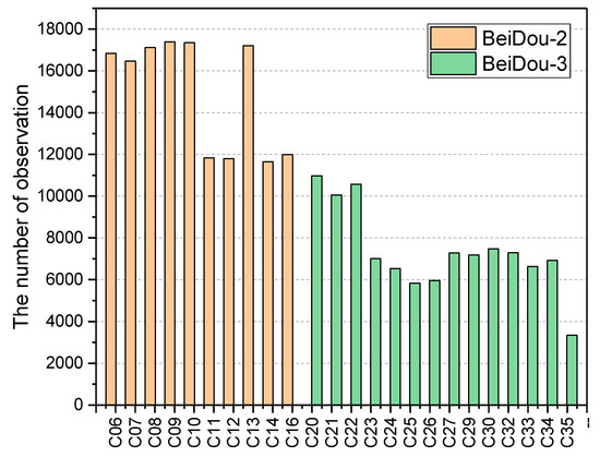 We selected one day (4 April 2019) to analyze the number of observations of BeiDou satellites. From Figure 2, it can be seen that: For the BeiDou-3 MEO, the average number of observations of C20, C21, and C22 was 10487, which had a factor that was of 1.5 times larger than that of other BeiDou-3 MEO satellites. For the BeiDou-2 MEO, the average number of observations was about 11758. In general, the number observations of BeiDou-3 MEO were smaller than that of the BeiDou-2 MEO satellite, especially for the C35 satellite.