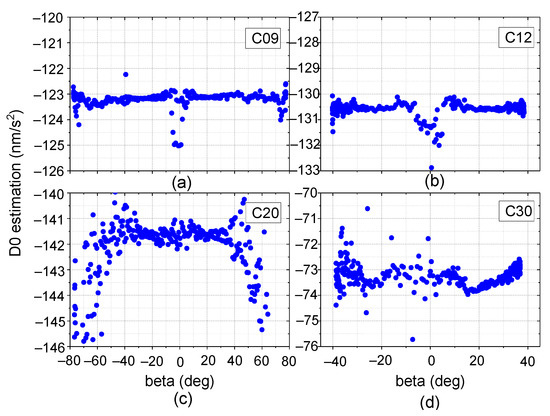 From Figure 3, it can be seen that the BeiDou-2 satellites had a smaller D0 variation than the BeiDou-3 satellites, except for the larger scatters near the maximum absolute β angle and near the zero, and the range of the D0 variations was smaller than 0.5 nm/s2 for C09 and C12. However, the systematic variation of D0 was about 5 nm/s2 when |β| > 40° for C20.