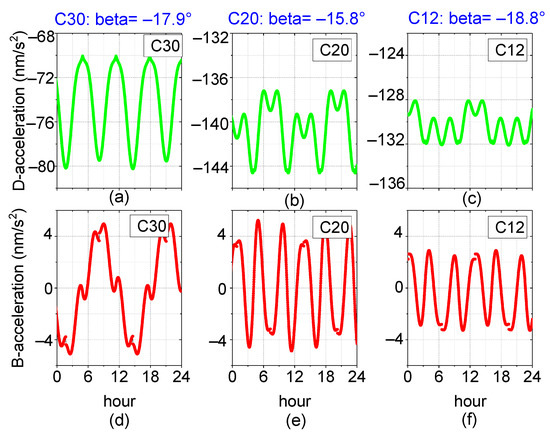 D—(green scatters) and B—(red scatters) solar radiation accelerations derived from the adjustable box-wing (ABW) model. (a–c) are the D—accelerations for C30, C20, and C12, respectively; and (d–f) are the B—accelerations for C30, C20, and C12, respectively.
