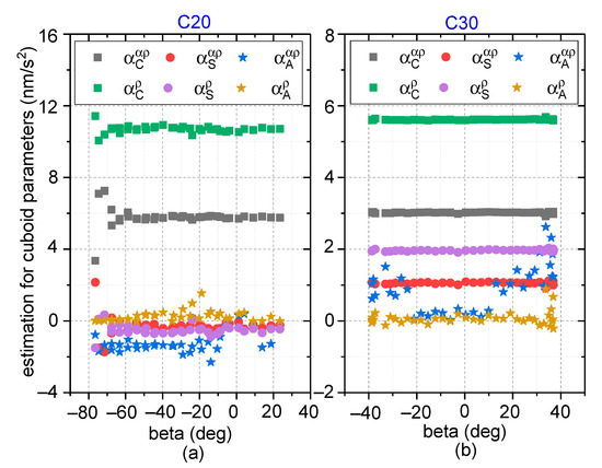 Based on the function model of Equations (6) and (7), the parameters of , were estimated by a separated least-squares adjustment, where the D- and B-accelerations derived from the ABW model were used as the observations. Therefore, the total parameters are (named cuboid parameters) and (named constant parameter). To cover a whole range of the β-angle, long range data processing is necessary. Considering the efficiency of the data processing, we used a step of 10 days to cover the β-angle range. The period is selected from the DOY of 218 in 2018 to the DOY of 058 in 2019. The estimation of the cuboid parameters of C20 and C30 are shown in Figure 5.