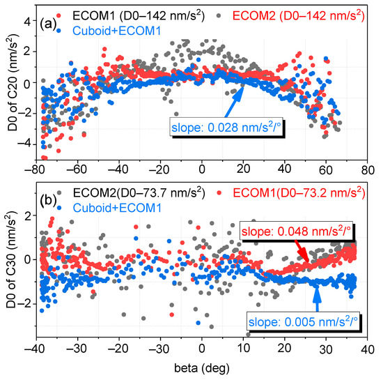 For the ECOM2 model, the scatters of D0 were larger than those for ECOM1 and Cuboid + ECOM1. The main reason was that the function of the D-accelerations was not a constant of ECOM2 (Equation (2)) for an arc-length. Therefore, only the D0 variations of the ECOM1 and Cuboid + ECOM1 were compared. For C20, the STD of D0 was 1.28 and 0.85 nm/s2 for the ECOM1 and Cuboid + ECOM1 solutions, respectively, and we found that the Cuboid + ECOM1 model can reduce the variation by about 34%. However, for 0 < |β| < 40°, a linear systematic variation, with a slope of 0.028 nm/s2/°, was found. This might be improved by accurate body-dimensions, rather than the “guess” values of the CAST’s satellites. For 14 < β < 40°, a linear systematic variation, with a slope of 0.048 nm/s2/°, was found for C30, when the pure ECOM1 model was adopted for POD. After adding the cuboid model, the linear slope was reduced to 0.005 nm/s2/°. This also proved the previous inference on the D0 variation of C30 (Figure 3), i.e., that the systematic variation of D0 was greatly reduced by the and parameters of the a priori cuboid model.