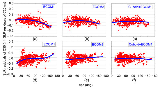 The one-way SLR residuals are shown in Figure 7. The blue line was the cubic polynomial fitting curve of the SLR residuals. From the fitting curve, it can be seen that: For the ECOM1 model result, a systematic variation between the lower and higher -angle was about 14 cm for the C20 and C30 satellites. When the ECOM2 and Cuboid + ECOM1 models were used, the variation was significantly reduced to about 5 cm. Thus, the ECOM2 and Cuboid + ECOM1 models can reduce the systematic variation of the SLR residuals.